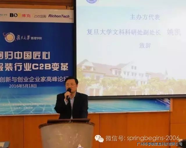 5月18日下午13:00,万众期待的“引领服装行业C2B变革,创新与创业企业家高峰论坛”在复旦大学管理学院如期召开并于下午17:30完美落幕,本次论坛由复旦大学管理学院主办、广州28圈信息科技有限公司协助举办,会场内座无虚席,200余人到场参会。论坛邀请了多位资深学者、成功企业家等重磅嘉宾纯干货主题演讲,受到广泛好评,会议进行中掌声持续响起。
